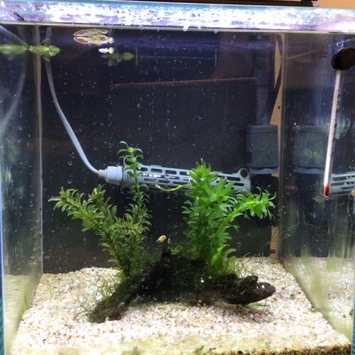 こんにちは〜Mr.アクアでーす。 今日は、前回に引き続き僕の水槽紹介パート2です。 今日は、『グッピー水槽』を紹介します。 現在は、グッピー4匹とミナミヌマエビ5匹を飼育しています。中央の木には、ウィローモスを活着させています。グッピーは、水槽の上…